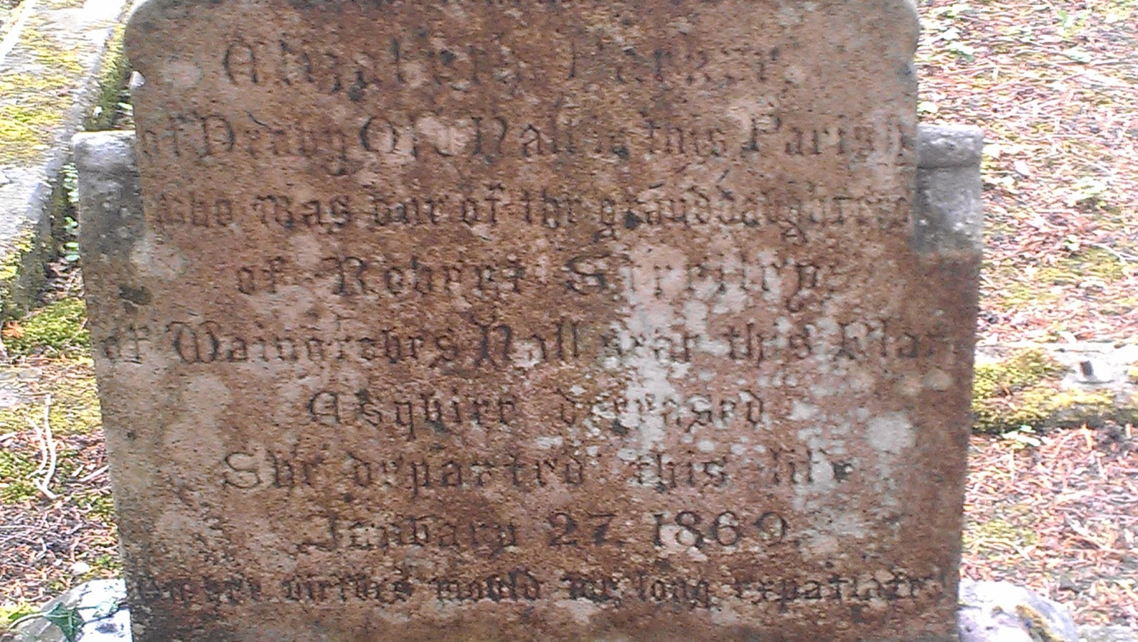 weathered grave of Elizabeth Parker 1811 - 1862. She was another granddaughter of Robert Strelley and sister to Robert Strelley Parker and Georgina Grace Davonport.